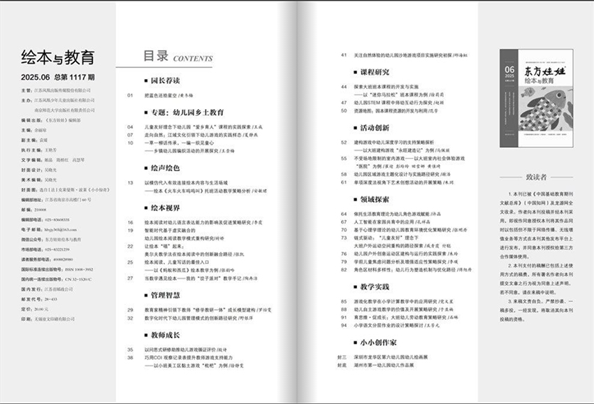 《東方娃娃繪本與教育雜志》作為《東方娃娃》期刊群的重要組成部分,雜志依托兩大專(zhuān)業(yè)出版社的資源優(yōu)勢(shì),將學(xué)術(shù)性與實(shí)踐性深度融合,創(chuàng)刊25年來(lái)始終秉持“打開(kāi)一扇閱讀的門(mén),開(kāi)始一生愛(ài)的旅程”的辦刊宗旨,致力于為3-9歲幼兒的家長(zhǎng)及教育工作者提供科學(xué)、系統(tǒng)的繪本閱讀與素質(zhì)教育解決方案,其發(fā)行量與國(guó)際影響力長(zhǎng)期位居國(guó)內(nèi)同類(lèi)期刊前列。